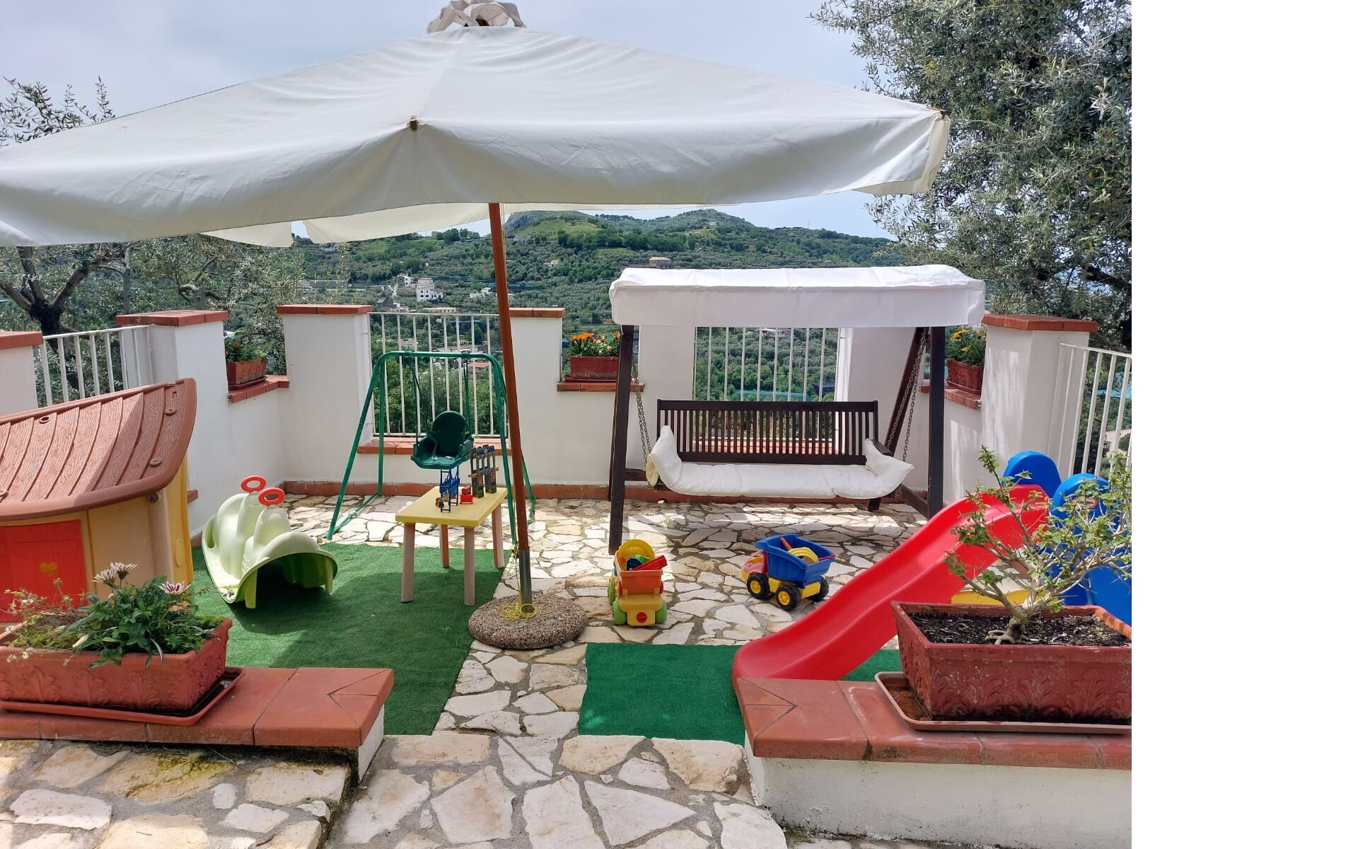When you arrive you’ll find a lovely clean well-maintained property with views of the mountains and the sea perfect for a peaceful vacation in Campania. Regardless of how you spend your days - visiting museums, sightseeing, shopping or just driving in the countryside, when you arrive home you can unwind with your family and friends at the pool for a perfect ending to another day in Campania. Outside you will also find a patio, barbecue grill and playground. Sharing a meal with friends and family is a big part of the Italian culture. Take advantage of the well-equipped kitchen to prepare meals using local produce while on your vacation. The kitchen includes coffee machine, microwave, toaster and refrigerator, as well as, plenty of tableware and cutlery for up to 16 people. Dine 'al fresco' like a real Italian, the fully furnished veranda is the perfect setting to enjoy food, family and the beautiful Italian weather.