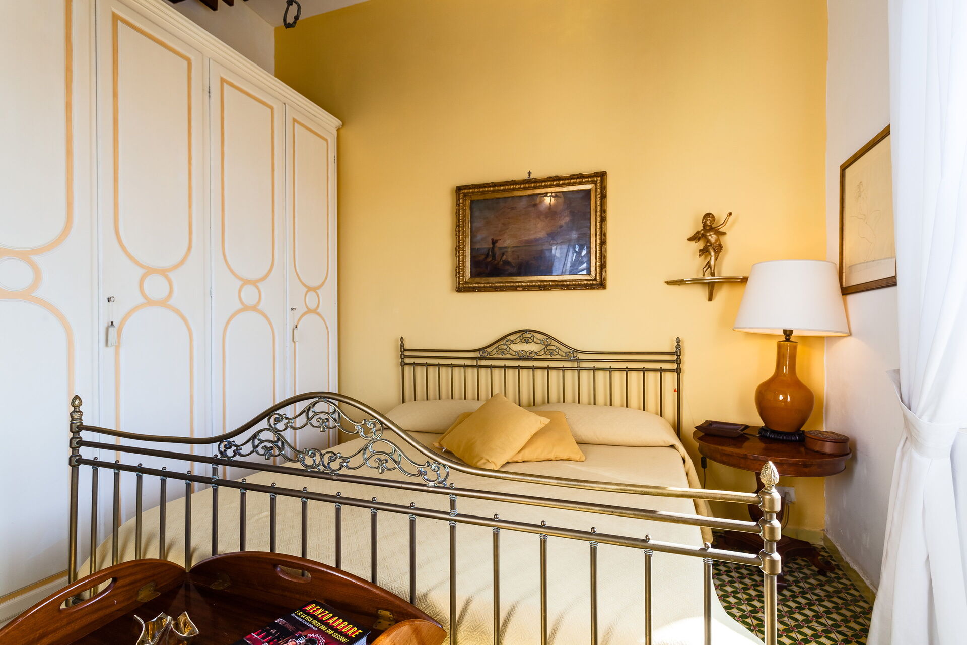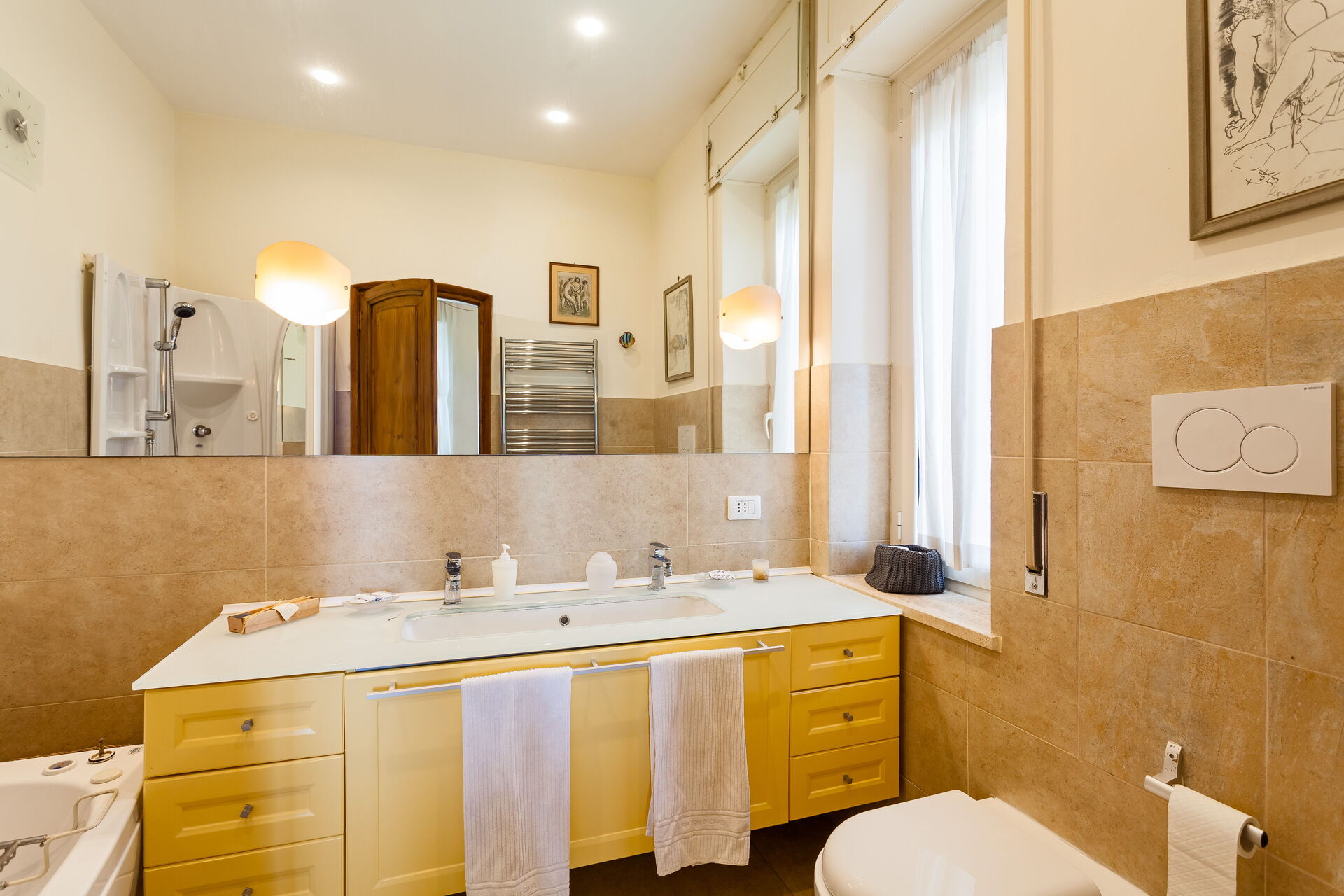 Bedroom + Ensuite Bathroom: double bed, two single beds, WIFI internet, air conditioning, television, working desk, fridge, basin, toilet, bidet, bathtub, shower, hairdryer, exit to the garden.