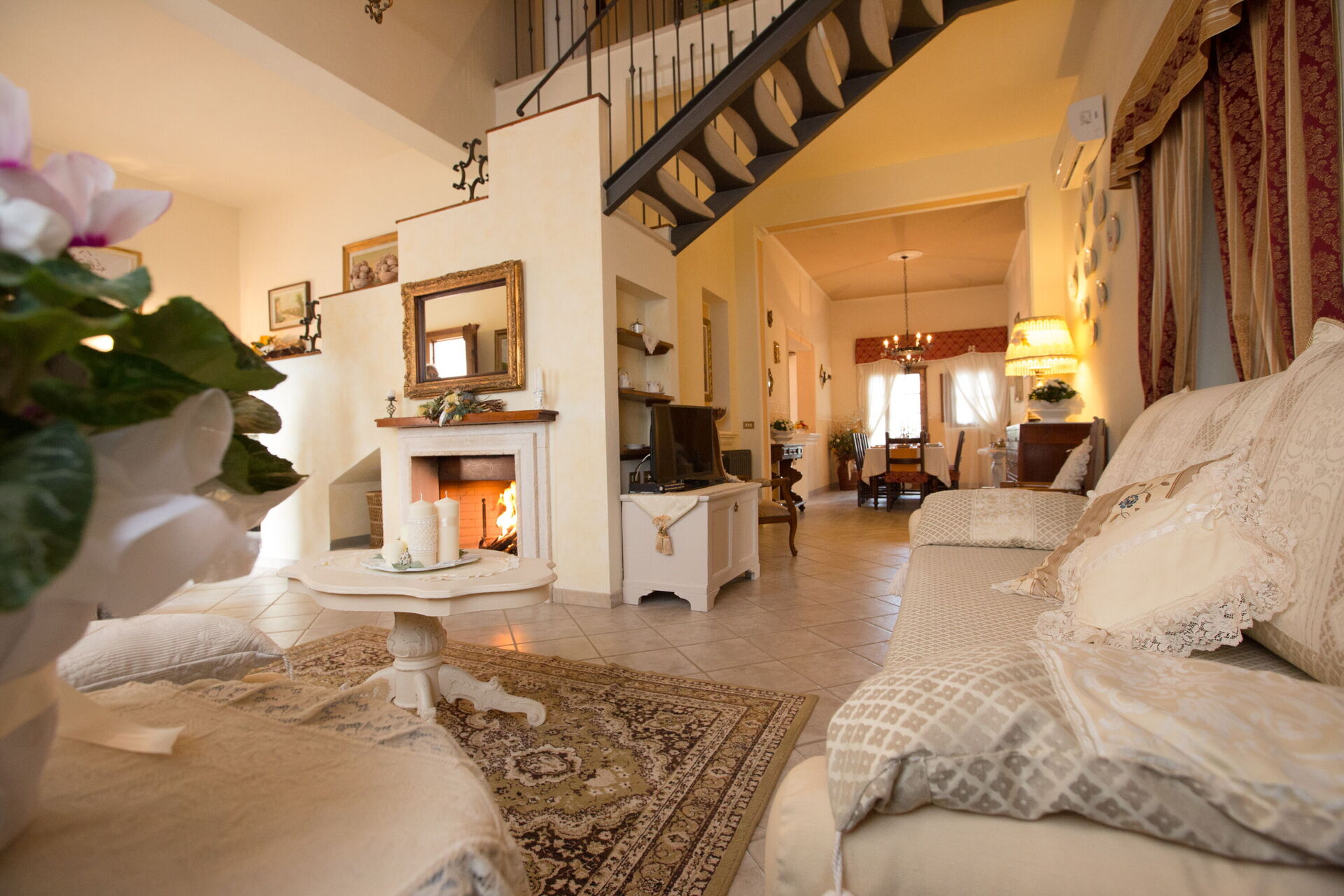 Open space: two sofas (people: 8), two armchairs, fireplace, dining table (people: 8), WIFI internet, air conditioning, television, mosquito net, exit to the garden, loft.