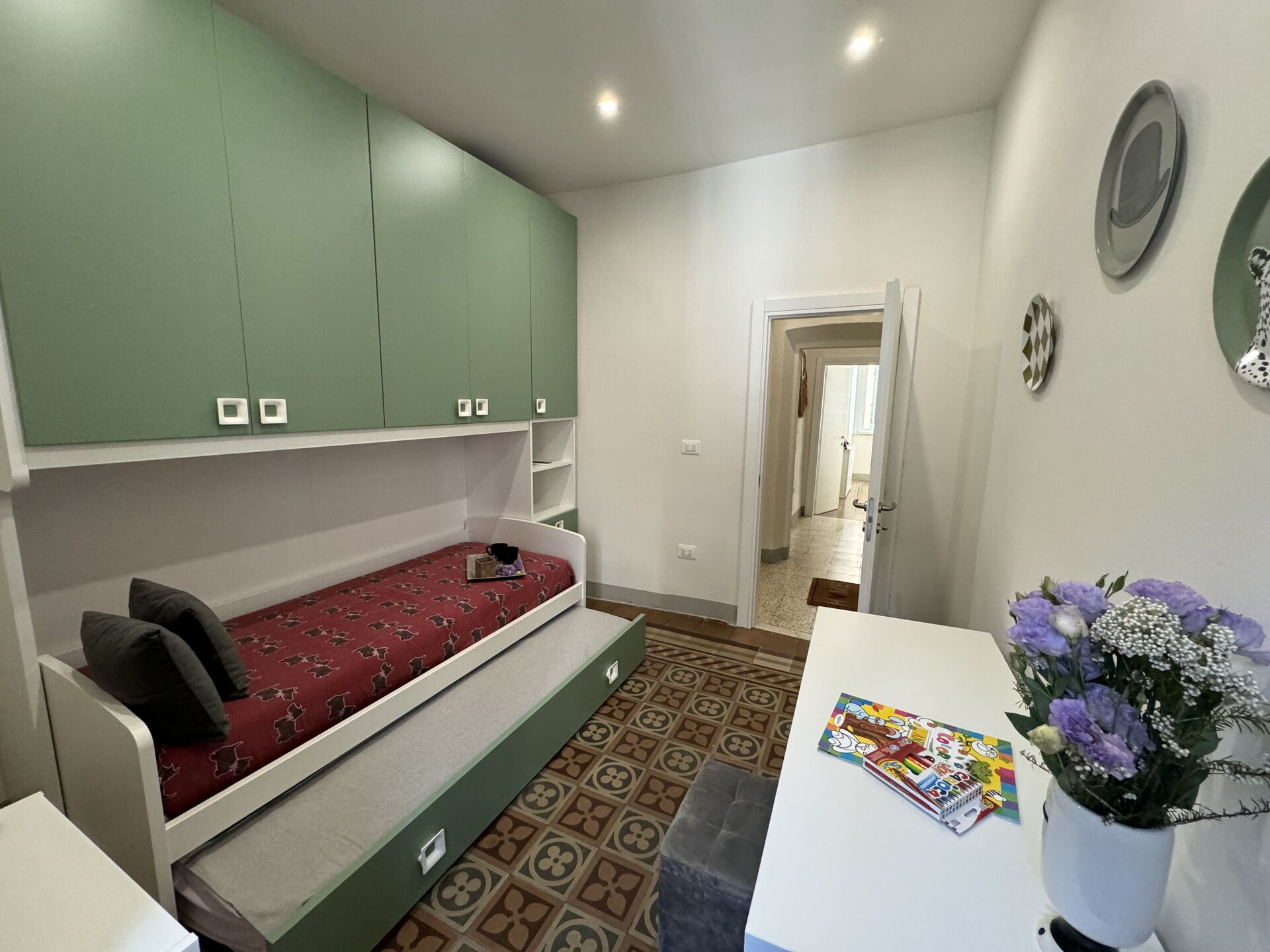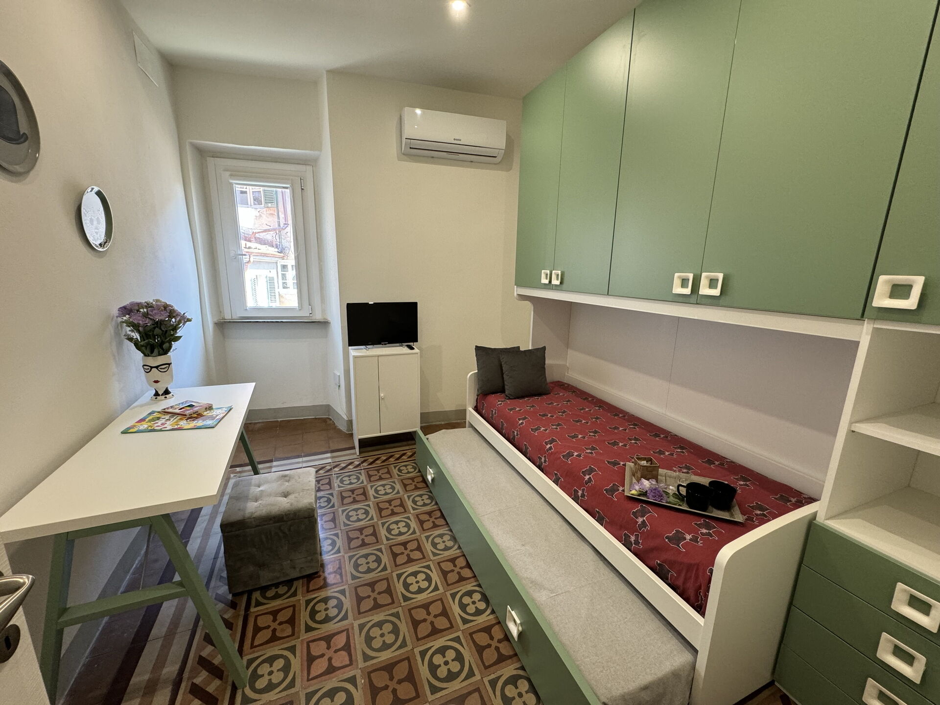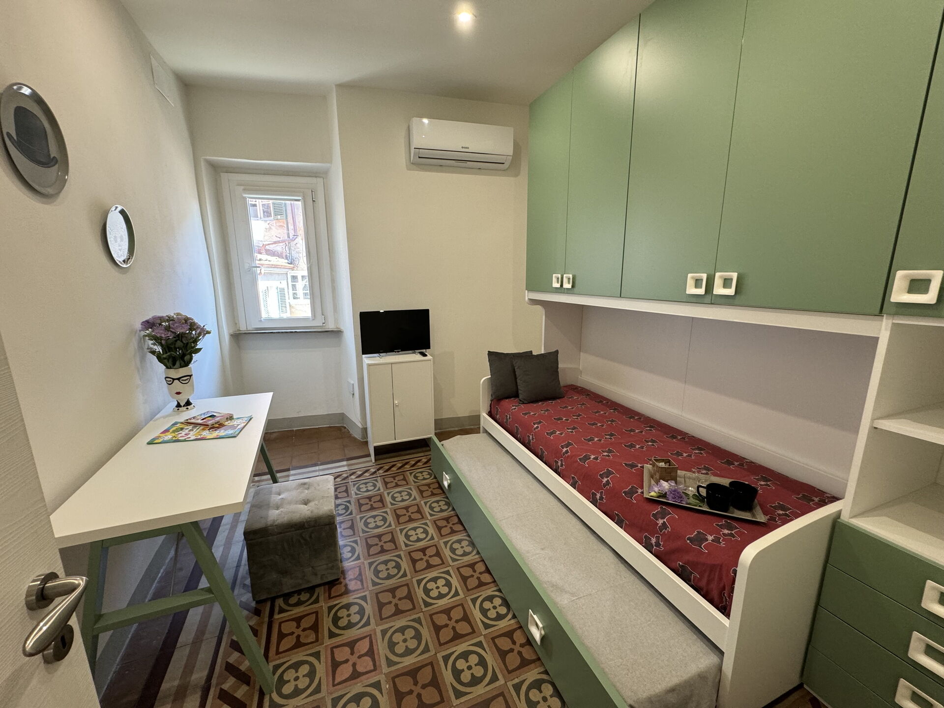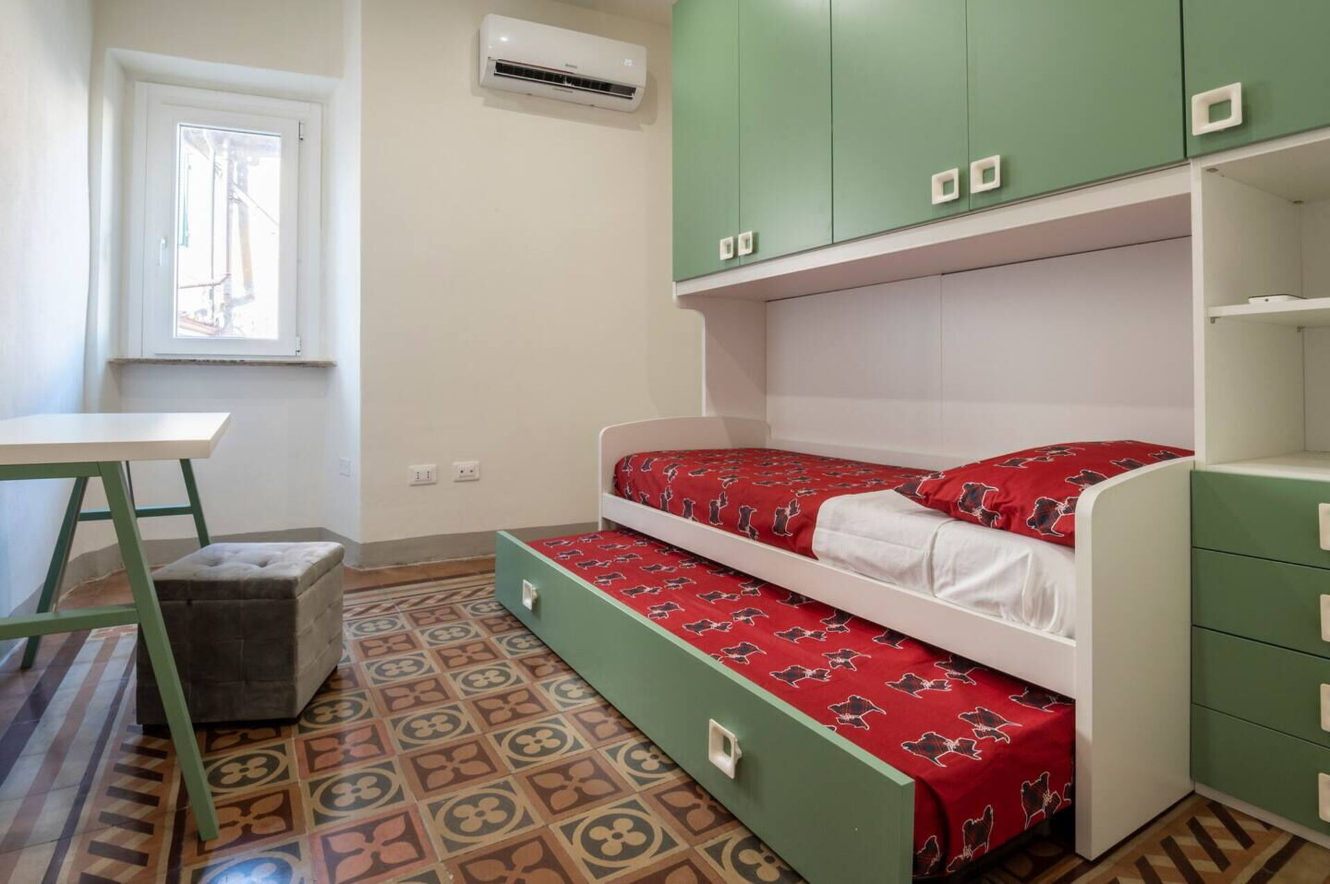 Bedroom 2: two single beds, air conditioning, working desk.