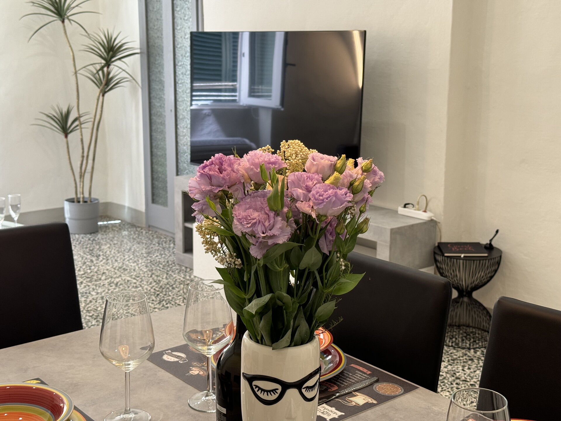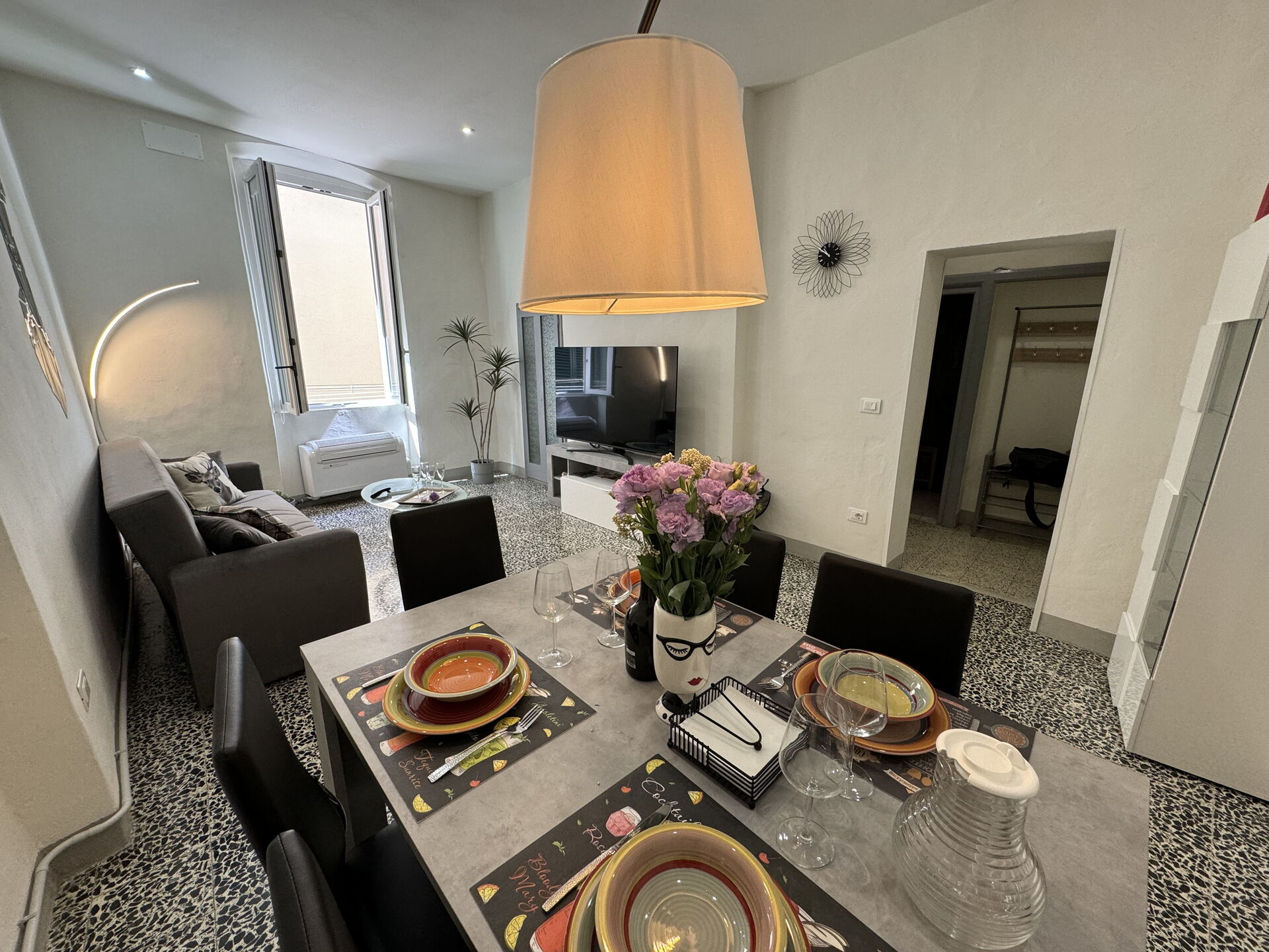 Living room: dining table, sofa bed, air conditioning, television.