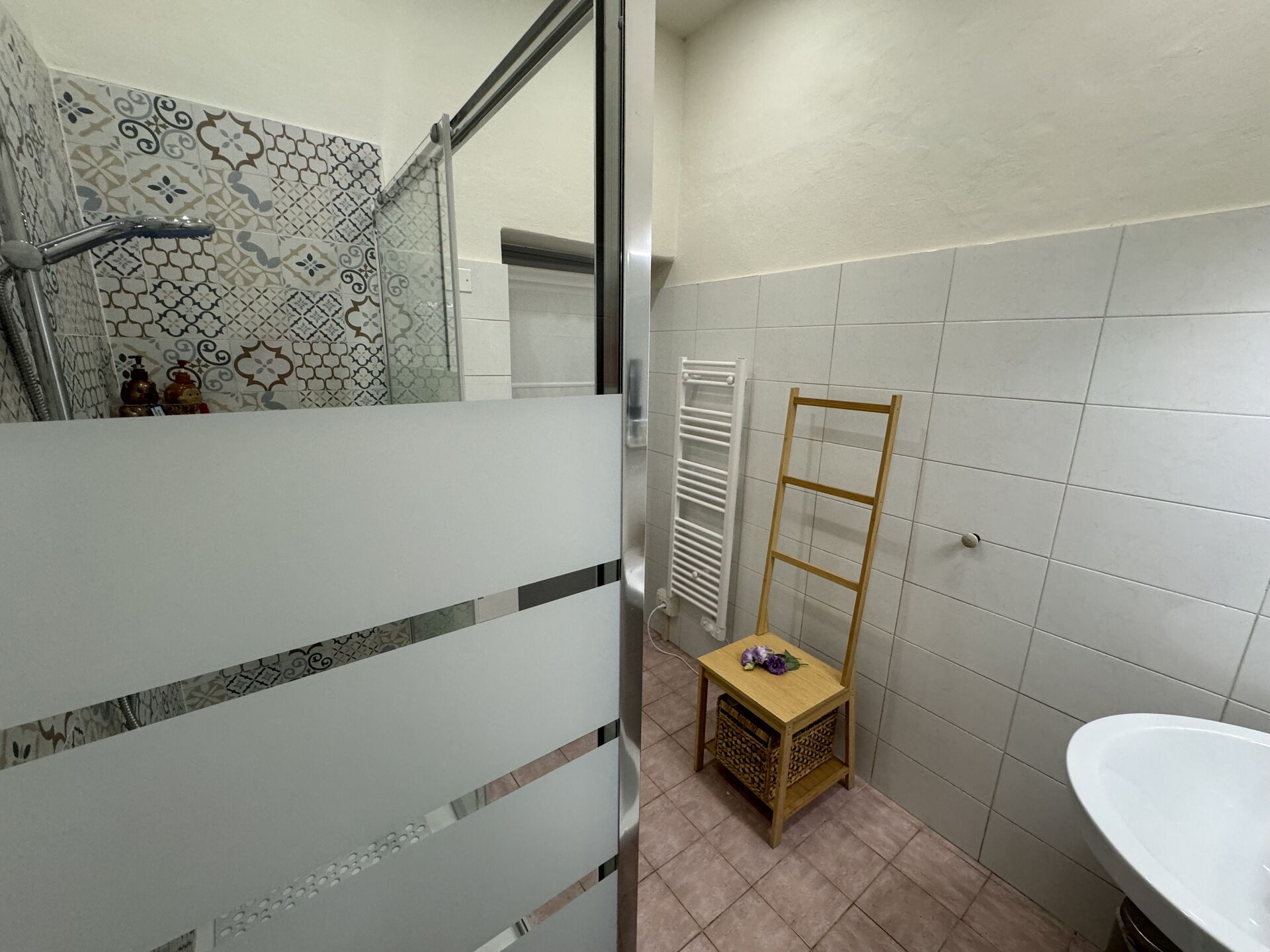 Bathroom: basin, toilet, bidet, shower.